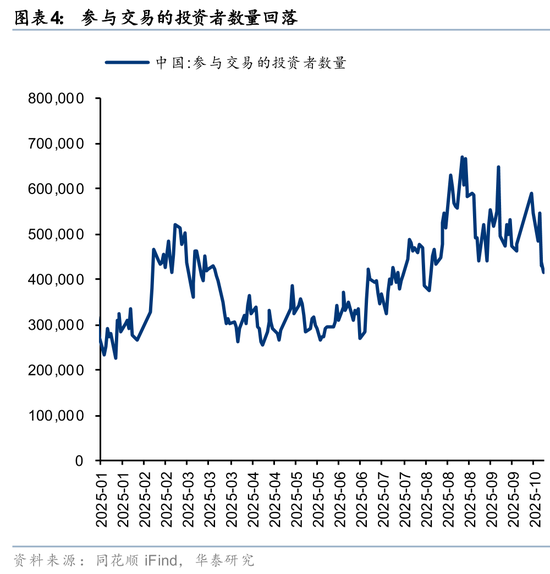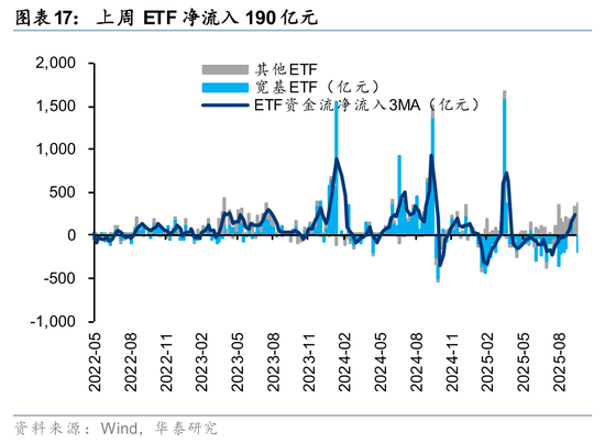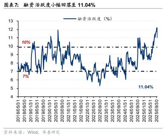 上周,交易型资金热度稍有回落,但仍在活跃区间:1)上周参与交易的投资者数量边际回落至9月初水平,以小单交易统计的散户资金转向净流出137亿元;2)9月底以来,融资余额净流入速率显著放缓,上周再度转向净流出,融资活跃度环比回落至11.0%,为2025年9月以来最低值,但仍在2016年以来高位水平;3)私募基金备案数量环比回升至270家,回归8月发行数量的中枢水平。
