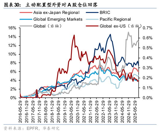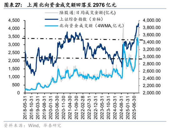 上周海外风险扰动下,市场缩量震荡,我们此前提示,市场赚钱效应指标、情绪指标已回落至历史中枢水平,资金指标降温或是衡量市场回调是否充分的重要指标。我们观测到各类资金投资行为分化但整体仍在活跃区间,承接动力仍存:1)交易型资金热度回落,散户资金、融资资金均转向净流出,融资余额净流入速率显著放缓,但以融资成交额占比衡量的交易型资金活跃度仍在高位水平;2)但配置型资金“抄底”意愿有所回升,公募基金仓位自8月中旬后首次出现回升迹象,以EPFR统计的主动配置型外资上期净流入规模创2025年以来新高。