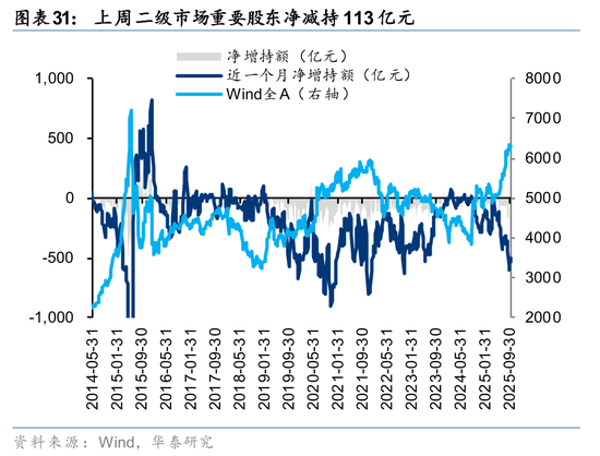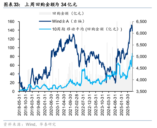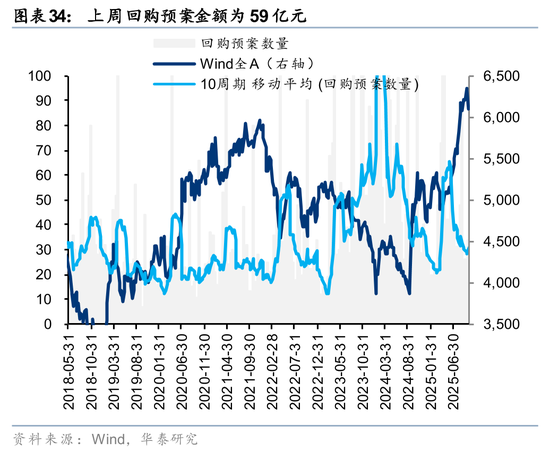 上周二级市场重要股东净减持113亿元。解禁市值方面,本周解禁市值633亿元,供给端压力环比回落。回购方面,上周二级市场股票回购金额34亿元,回购预案金额为59亿元,回购金额环比前期小幅回升。