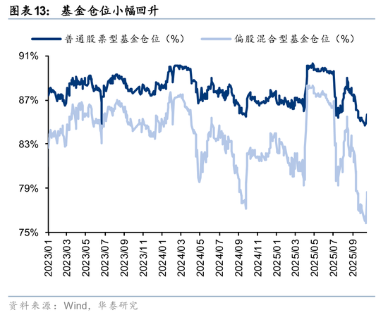 上周配置型资金“抄底”意愿回升:1)公募基金仓位自8月中旬后,首次出现回升迹象,配置端来看,基金加仓呈现一定哑铃型策略,加仓金融等防御性品种,博弈消费,对回调较多的TMT关注度小幅回升;2)以EPFR统计的主动配置型外资上期(10月8日-10月15日)净流入7.8亿元,单期净流入规模创2025年以来新高。