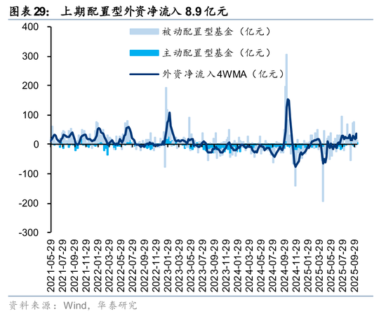 上周北向资金日均交易额回落至2976亿元。以EPFR统计的配置型外资中,2025.10.08-2025.10.15,配置型外资净流入8.9亿元,其中主动配置型外资持续流入7.8亿元,被动配置型外资净流入1.1亿元。截至9月初,各类主动配置型外资对A股仓位均有回落,仍有一定加仓空间。