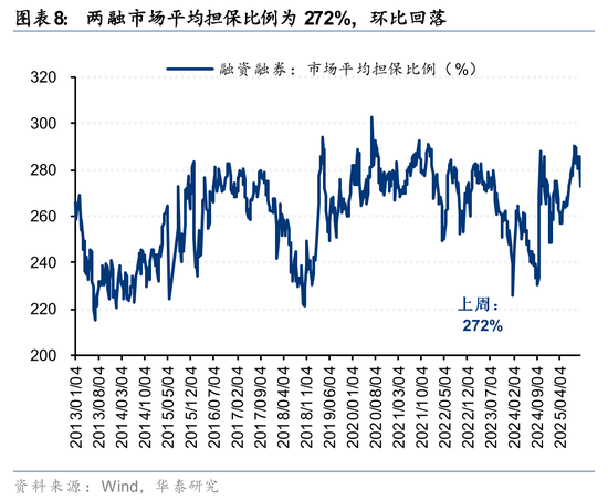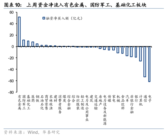 融资资金上周净流出128亿元,融资交易活跃度维持高位。①上周融资资金流出128亿元,②融资交易活跃度环比小幅回落至11.04%,③上周市场平均担保比例为272%,环比小幅回落,④结构上,融资资金净流入有色金属、国防军工、基础化工等行业,净流出电子、通信、计算机等行业。