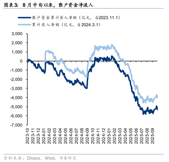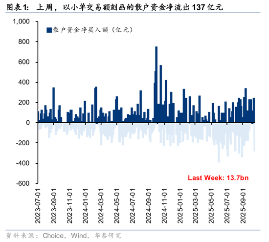 散户资金上周净流出137亿元。①数量角度,上周参与交易的投资者数量回落;②流量角度,2025年8月中旬以来,散户资金净流入;③方向角度,上周散户资金净流入银行、有色金属、非银金融等行业,净流出计算机、基础化工、机械设备等方向。