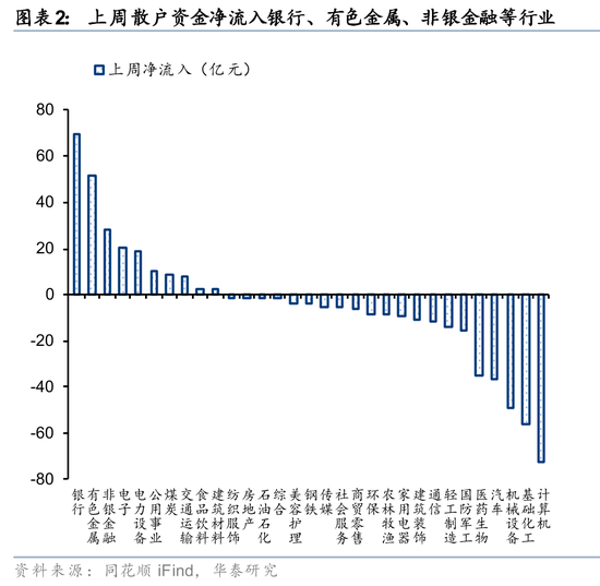 散户资金:上周资金净流出137亿元,上周散户资金净流入银行、有色金属、非银金融等行业,净流出计算机、基础化工、机械设备等方向;