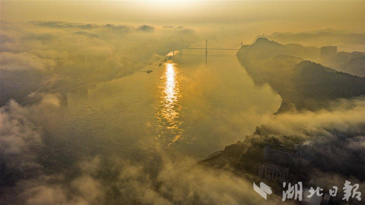 当日天微亮,暖湿气流与长江冷水面相遇凝结成雾,雾气沿江面缓缓蔓延,缠绕两岸山峦,将错落民居、林立楼宇化作隐约剪影。长江主航道上,船只仿佛游弋于云海之间,江面雾气蒸腾涌动,与远处的三峡山峦相映成趣,构成“白云回望合,青霭入看无”的诗意场景。作为长江上中游分界处的生态宜居之城,宜昌因独特的山水格局成为平流雾多发地。这种由暖湿空气遇冷下垫面形成的雾景,常将“水电之都” 装点成缥缈仙境,此次10 月下旬出现的平流雾,更让秋日峡江多了几分神秘韵味,成为城市生态美景的生动注脚。(湖北日报全媒记者 刘曙松 摄)